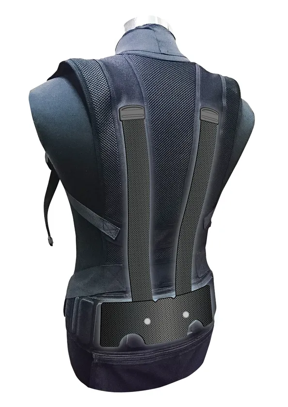 特許も取得した画期的な構造は、背骨を挟んで、S字型に湾曲した2本のカーボン(炭素繊維)板です。荷物などを持つために屈んでも、背骨の動きを邪魔せず、また背中のS字カーブ板に反発力が働くので、身体にかかる負担を軽減します。腰への負担が約7.4kg 軽減するデータも取得しており、介護や運送、農業、水産業界の方、作業員、あらゆる職場での肉体労働負荷の軽減と、身体の保護、特に腰痛軽減効果が期待できます。