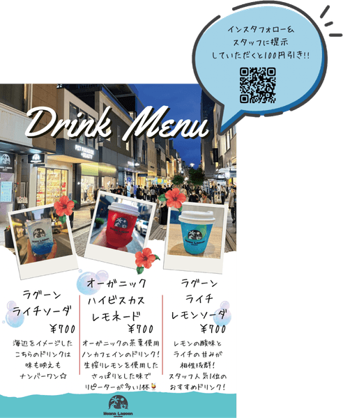 MoanaLagoon公式Instagramをフォローのうえ、当日スタッフに画面をご提示いただくと、お会計から100円引きとなります。