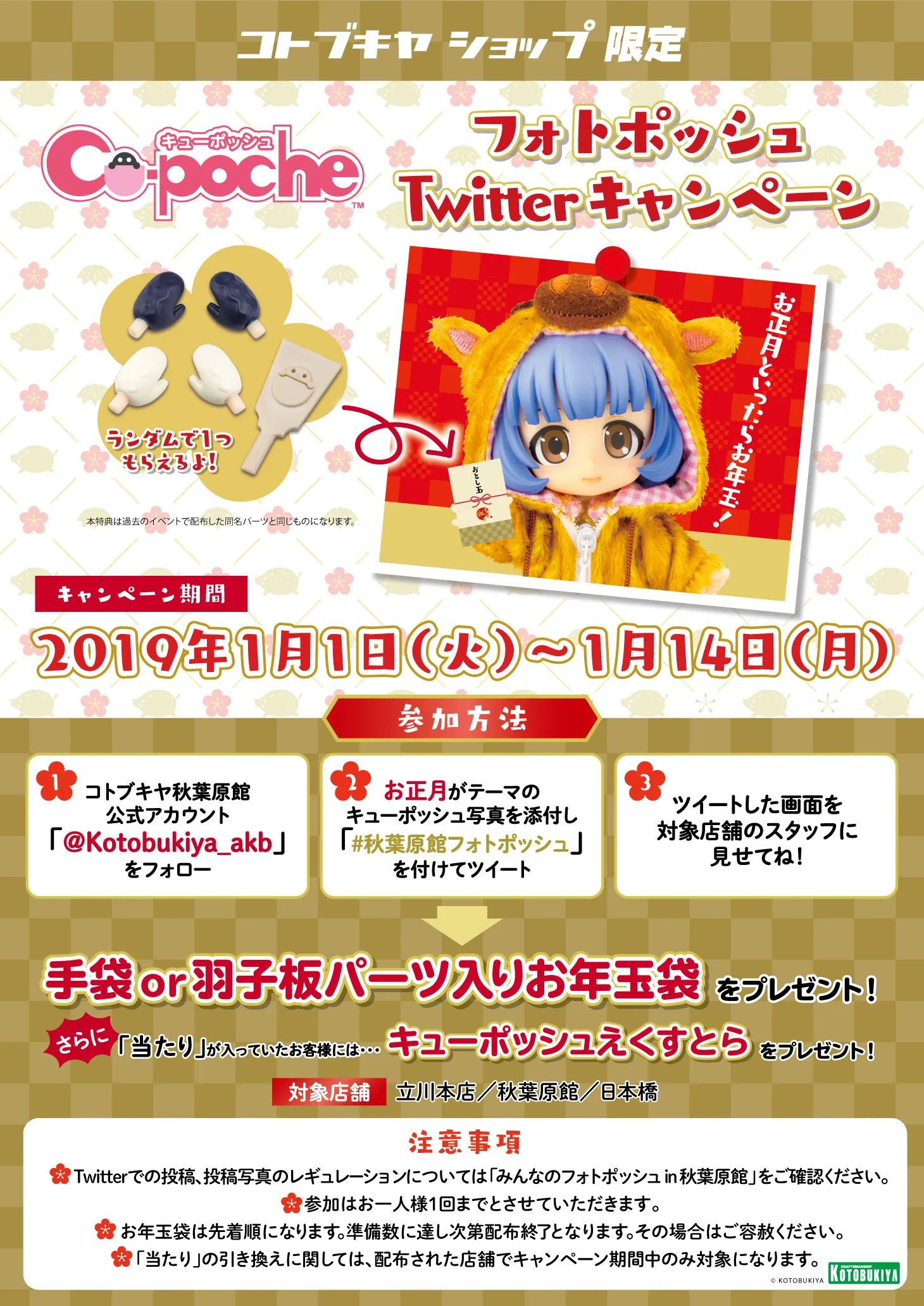 2019年1月1日(火)~1月14日(月)にお正月をテーマにしたキューポッシュをツイートして対象店舗のスタッフに見せていただくと「手袋パーツor羽子板パーツ入りのお年玉袋」をプレゼント!