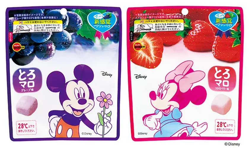 とろマログレープ味(ミッキーマウス)ととろマロストロベリー味(ミニーマウス)