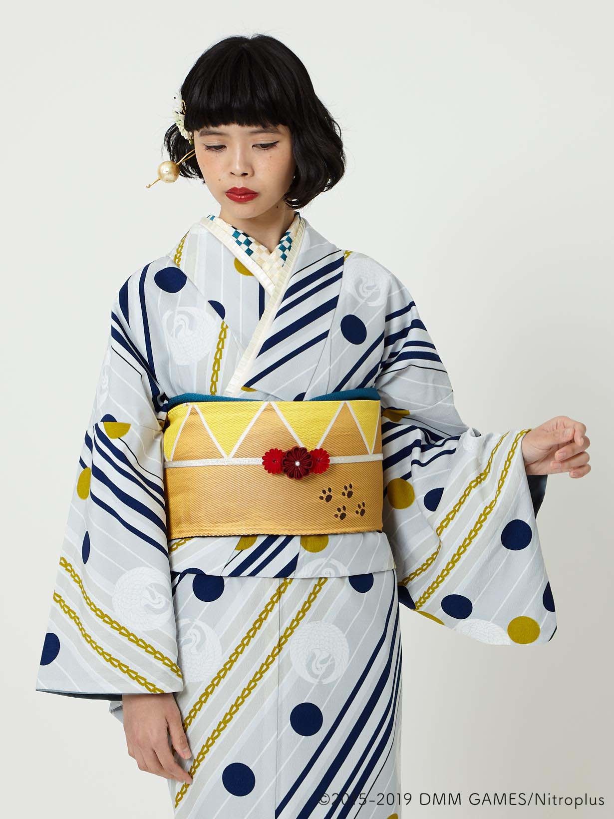 鶴丸国永の紋をモチーフに、「ふりふ」らしくもある幾何学模様のバイヤス柄と水玉を散りばめ、ポップな印象の仕上がりです。鎖はバイヤスの縞に見立てて、デザインのアクセントにしています。色はシックで全体的に落ち着いたトーンなので、着やすい着物です。