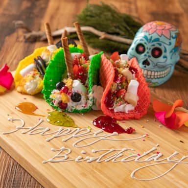 黄緑、黄色、ピンク、青のカラフルなタコスの皮にチョコレートやフルーツをふんだんにトッピングした、メキシカンバルならではの珍しいデザートです。お誕生日などの記念日にはメッセージ付きのタコスプレートもご用意でき、サプライズにも喜ばれる一品です。