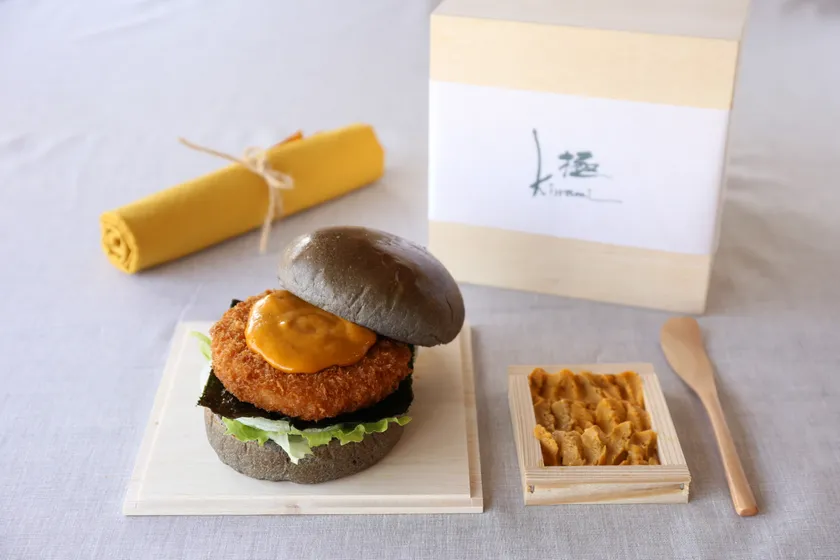 1日1個限定!淡路島産の生うに板1枚を塗って食べるバーガー登場 玉ねぎ染め風呂敷の包装、認定証付きで5,000円の極上の逸品