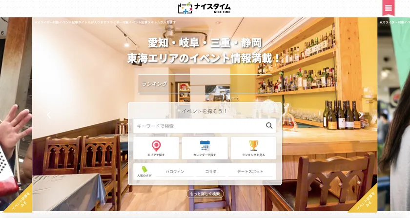 ナイスタイムは、東海エリア(愛知・岐阜・三重・静岡)のイベントを中心に掲載。音楽フェスのような大規模なイベントから小さな個展まで、ありとあらゆるイベント情報を紹介しています。「行きたい」と思った時に「楽しい」が見つかるウェブサイトです。