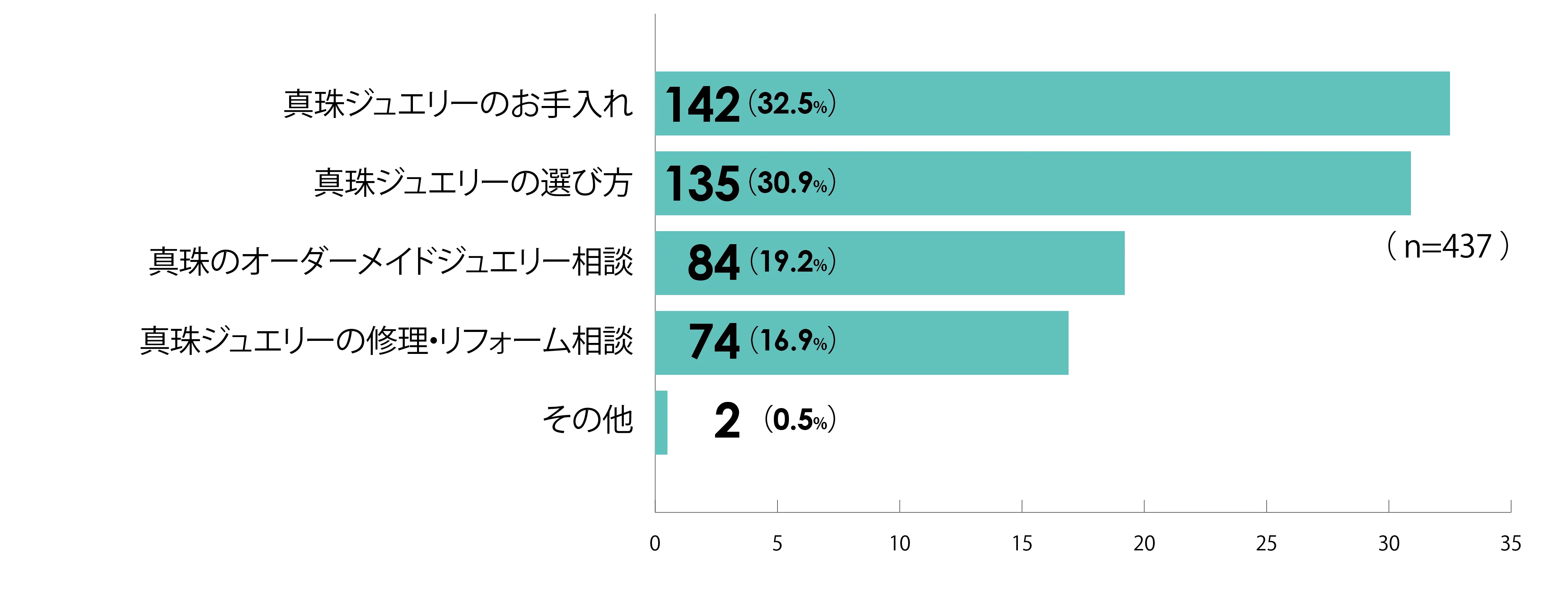 真珠ジュエリーを購入したタイミングの質問では「結婚」が17.9%と最も多くなっています。真珠ジュエリーを持っているに「はい」の答えは77.8%という中、年間の使用頻度は「年1~3回」56.4%となっており、結婚式や葬式・仏事など特別なシーンで使用されていることが多い傾向となっています。また、真珠が一粒から購入できることを知っている「はい」が43.9%となっており、真珠ジュエリーの選び方、お手入れ、修理・リフォーム相談、オーダメイド相談に参加してみたいという回答も多くなっています。