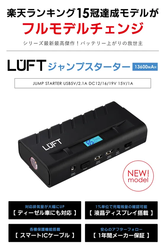 株式会社アイデンティティー(本社:兵庫県尼崎市、代表:丸富 英宇)は、楽天市場バッテリーチャージャー部門ランキング1位の自社ブランド【LUFT ジャンプスターター】の新モデルを発売いたします。(2018年12月28日時点)