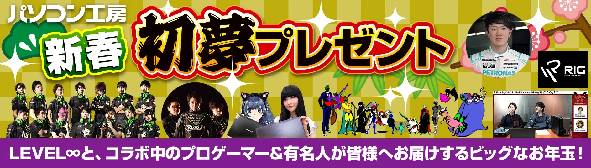 ゲーミングPC LEVEL∞(レベル インフィニティ)とコラボレーション中のプロゲーマー&有名人から、超ド級な初夢プレゼントが当たる、「新春初夢プレゼント」を開催します。1月1日(火・祝)から1月11日(金)までのセール期間中、パソコン工房・グッドウィル全店、およびパソコン工房Webサイトにて5,000円(税別)以上ご購入のお客様が対象です。