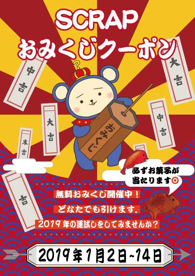2018年で設立10周年を迎えたSCRAPが、次の10年のスタートととなる2019年最初のお得なキャンペーン、『SCRAPおみくじクーポン キャンペーン』にどうぞご期待ください。