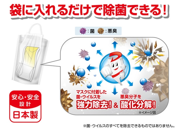 除菌剤を直接スプレーするのではなく、密閉された袋内で間接的にマスクを除菌します。隅々まで除菌でき、除菌後はすぐに装着することができます。
