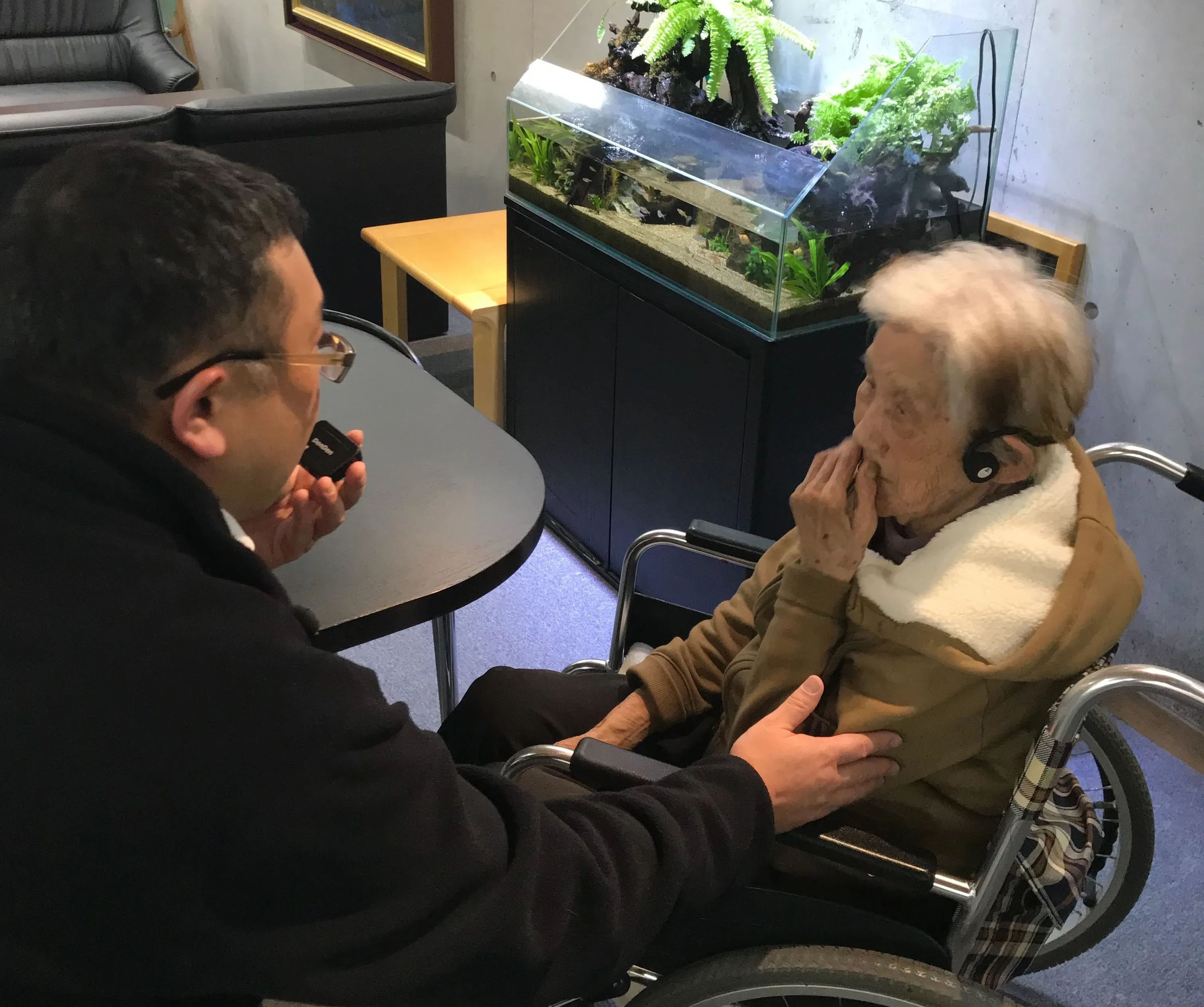 「何人かの入居者に使用してもらいましたが、中には会話ができなかった方が、歌の時間に音楽が聞こえたことにより一緒に歌を歌ったり、会話ができたりしたことや窓口カウンターで飼っていた鈴虫に気付かなかった方が、鈴虫の鳴き声が聞こえた事により鈴虫を楽しむ事ができた事例もありました。もちろん試してみたが、聴こえない方もいらっしゃいました。