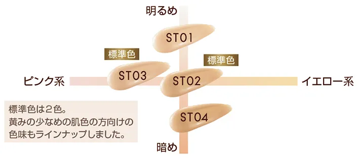 パーソナルカラーの意識が高まる中で、黄みの少ない色をお探しの方も増えてきています。お客様のお声を反映し、「ST03(ピュアオークル20)」をラインナップしました。