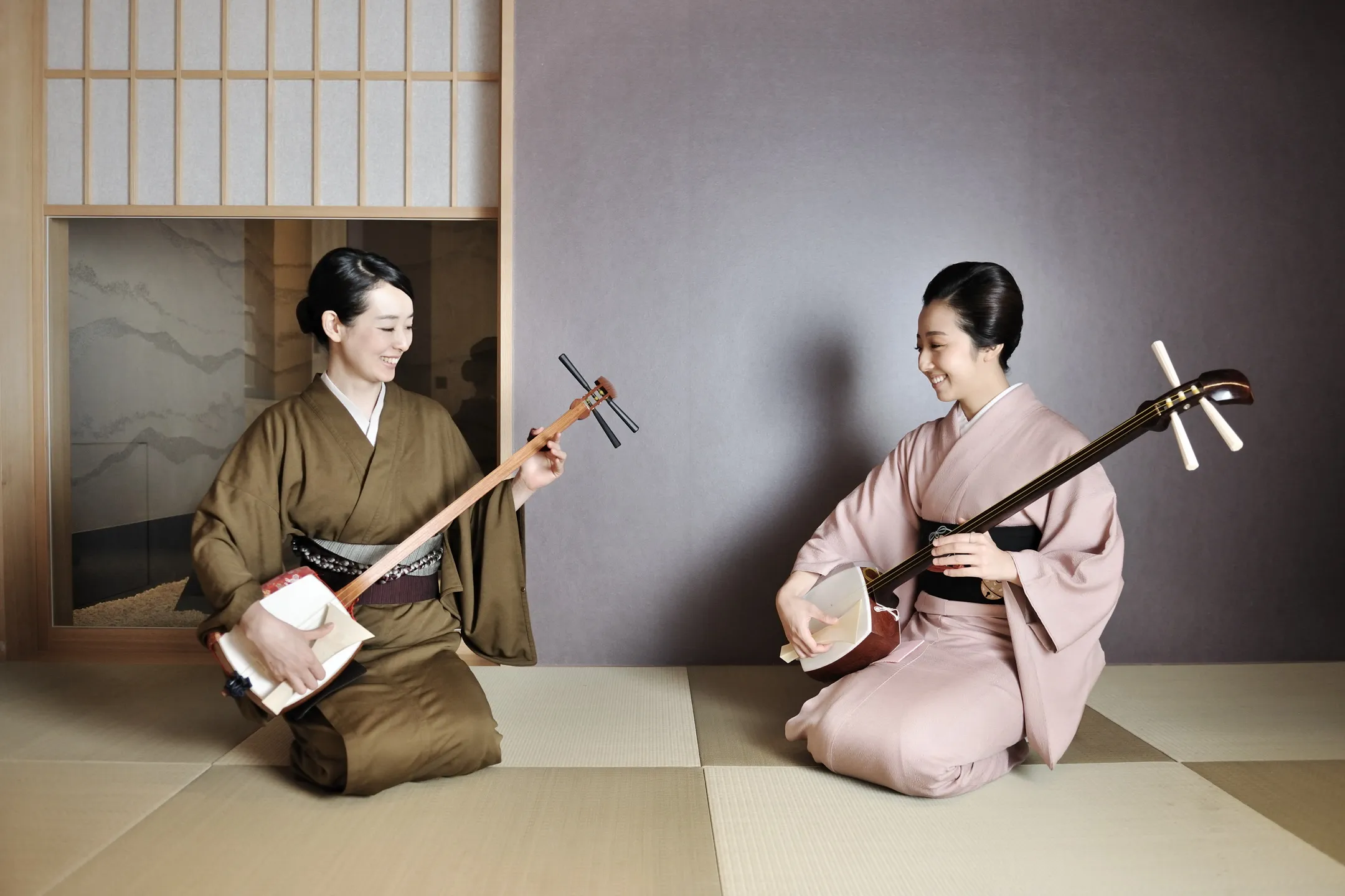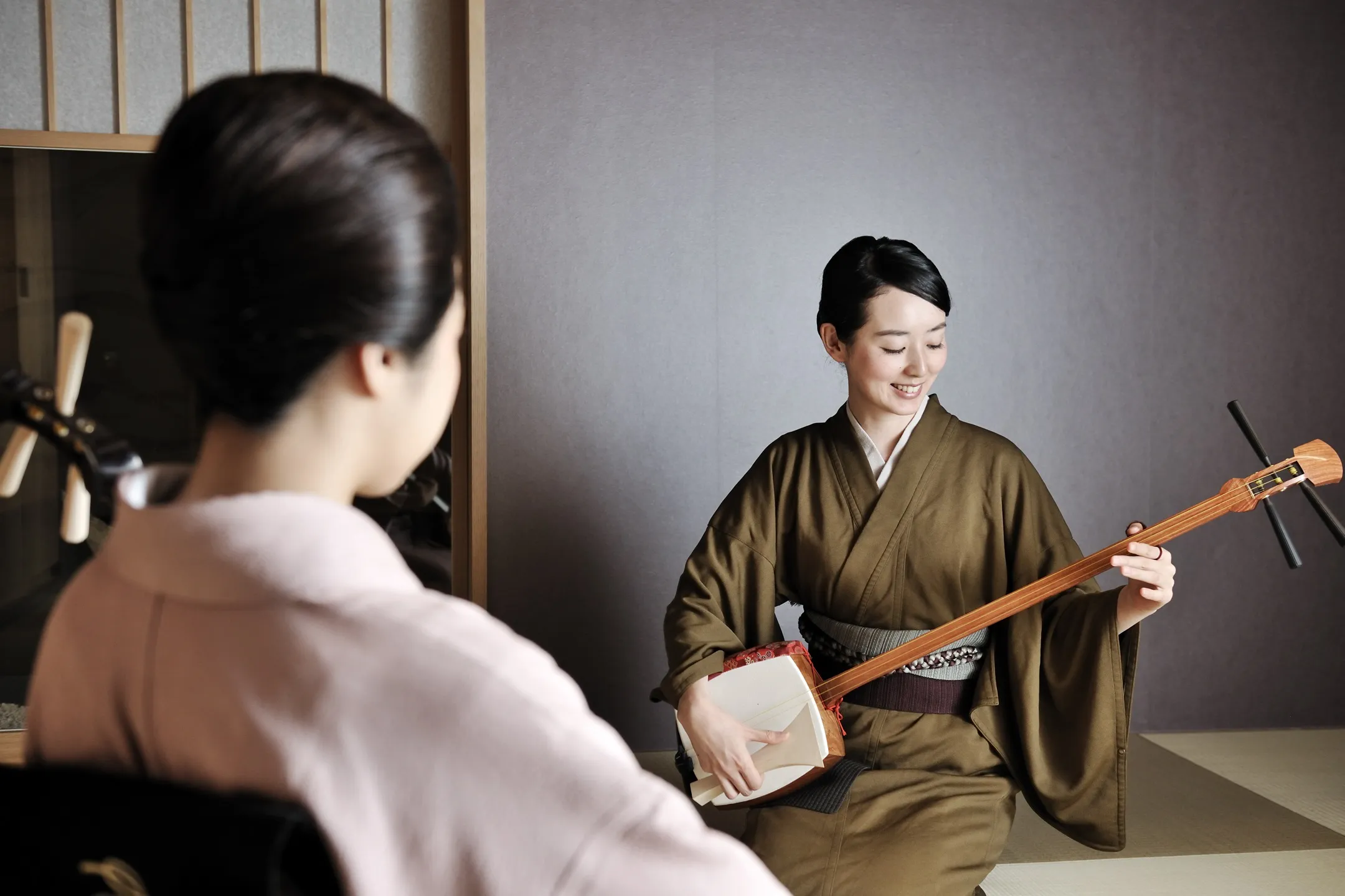 江戸時代、歌舞伎や浄瑠璃に使われる伴奏楽器の稽古は非常に人気があり、特に三味線は、手を返す動作や指の所作が女性らしい美しい仕草につながると言われ、女性の嗜みとして重要視されていました。江戸の町で発展した箏曲流派「山田流」の山田流箏曲萩岡派四世・萩岡松韻氏監修のお稽古を通じて、初めて三味線に触れる方でも一曲弾けるようになることを目指します。