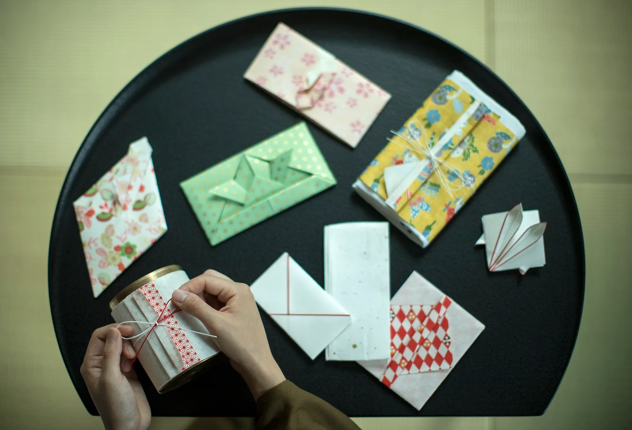 千代紙で贈り物を包む折形は、人にものを贈るという文化の始まりと言われています。この折形を体験できる道具をお部屋に用意します。紙幣やワインボトルの包み方など、現代の生活にも活かせる物の包み方を学ぶことができます。