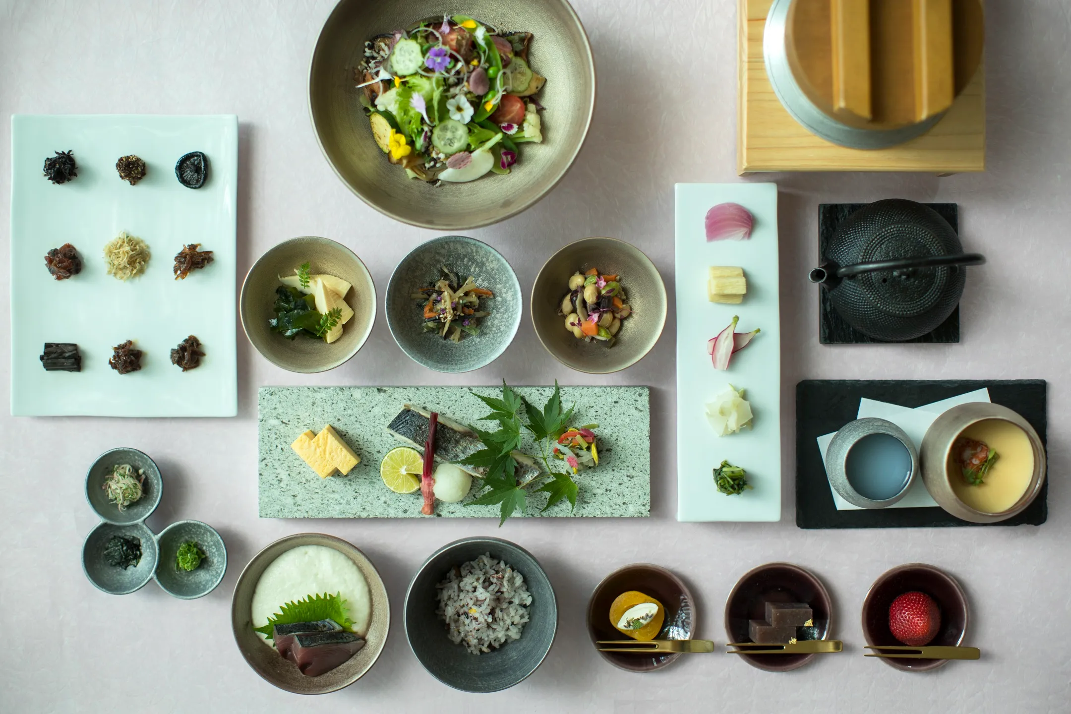 馬込半白キュウリや早稲田みょうがなどの江戸野菜を使った小鉢やサラダ、鰆や鮭などの焼き魚、あさりやあみえびを使った佃煮をお楽しみいただけます。季節の江戸野菜と旬の魚貝を取り入れ、体の内側から美しくなることを目指します。