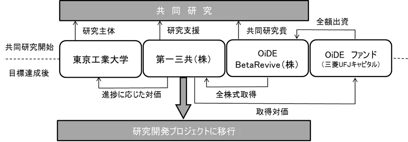 本研究を行うために新会社(OiDE BetaRevive(オイデ ベータリバイブ)株式会社、本社:東京都中央区、以下「BetaRevive」)を設立し、三菱UFJキャピタルが運営するOiDEファンド投資事業有限責任組合(以下「OiDEファンド*2」)から共同研究等に必要な資金を全額出資します。