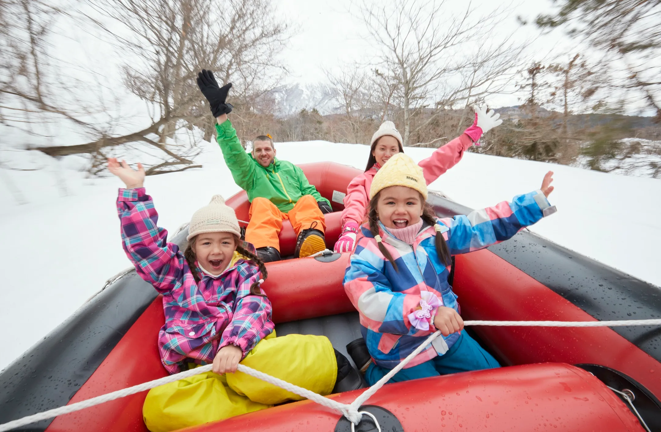 スノーラフティングでは、スノーモービルがひくゴムボードに乗り、雪の上を駆け巡ります。家族みんなで乗ることができ、ゴムボートがくるくる回ったり、時速40キロで疾走したりと、スリル感を味わえます。