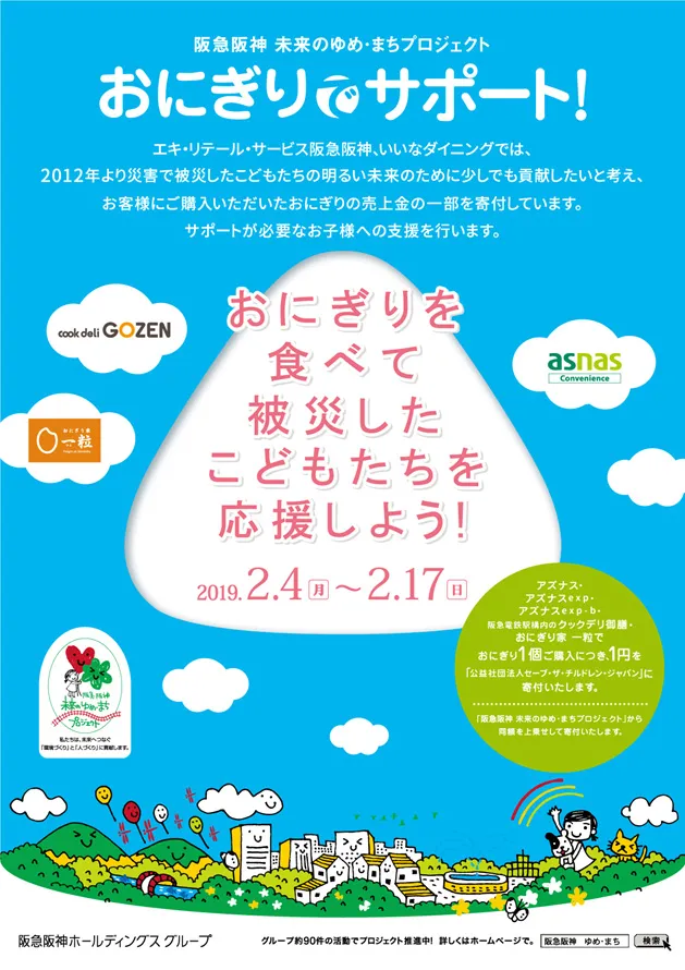 株式会社エキ・リテール・サービス阪急阪神と株式会社いいなダイニングは、西日本豪雨で被害の大きかった岡山県を中心としたこどもたちの支援を目的に、2019年2月4日(月)から2月17日(日)まで、『アズナス』『クックデリ御膳(阪急電鉄駅構内店)』など各店でおにぎり1個ご購入につき1円を「公益社団法人 セーブ・ザ・チルドレン・ジャパン」に寄付します。