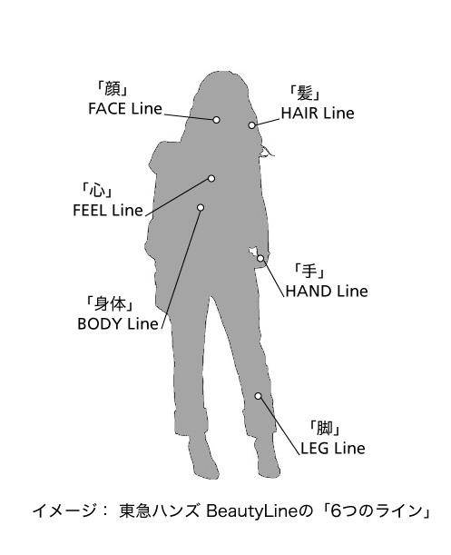東急ハンズ BeautyLineの「6つのライン」今回のBeautyLine(ビューティライン)では、美しく自分らしくありたい女性のためにハンズがひく6つの道しるべ=「Line」として、従来のヘルス&ビューティコーナーを刷新し、女性が美しく凛とした自分の線=「Line」を、「FACE Line」、「HAIR Line」、「BODY Line」、「LEG Line」、「HAND Line」、「FEEL Line」という6つのカテゴリーの商品で磨いていくための、ラインアップをご用意しております。