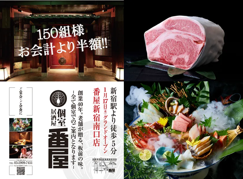 <新店オープン記念> 神戸牛も、本まぐろも半額! 総勢150組様 お会計半額キャンペーン! 『個室居酒屋 番屋』新宿南口店が1/17(木)オープン