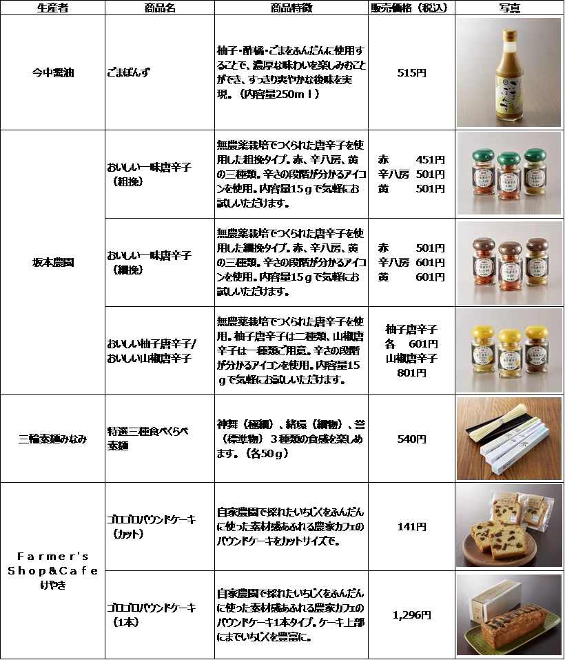 地域商社事業に取り組む株式会社近鉄百貨店と奈良県商工会連合会は、昨年7月に奈良県産品販路開拓支援の取組みを開始し、奈良県内において地域の新たな魅力を生み出す商品開発支援を進めてまいりました。この度、奈良県内の生産者である「今中醤油」「坂本農園」「三輪素麺みなみ」「Farmer’s Shop&Cafe けやき」「上島製菓」「山崎商店」を開発支援し、地域商社事業第二弾となる奈良の新たな名産品が誕生しましたのでお知らせします。6つの生産者と取り組んだ21の商品開発支援商品については、奈良の新たな魅力を生み出し発信するコンセプトショップ「大和路ショップ」(近鉄百貨店 奈良店地階フロア内)にて1月16日(水)より販売開始します。