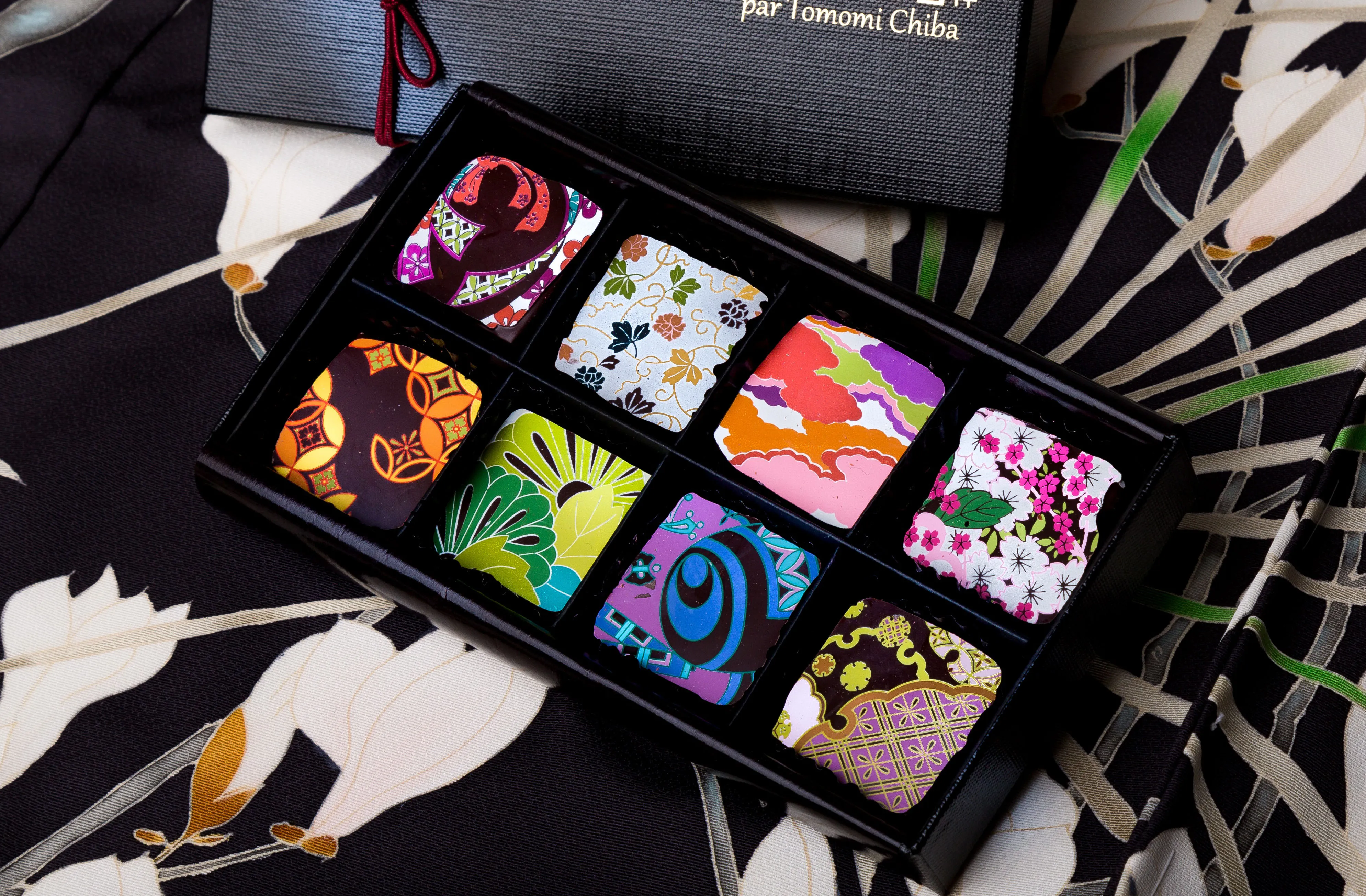 昼はカフェタイム、夜はバータイムの2部構成になっており、お香体験や日本酒片手に映画鑑賞など、時間帯で異なる京都の魅力に触れていただくことができます。カフェ・バーをご利用いただいた方には、パリの精神と京都の伝統美“京友禅”がコラボした、WEB以外では京都でしか購入できない「Chocolatde 吉祥」のショコラもサービス。艶やかな見た目と、京都ならではの素材を使用した上品な味わいが広がるショコラはぜひこの機会に試したい一品です。