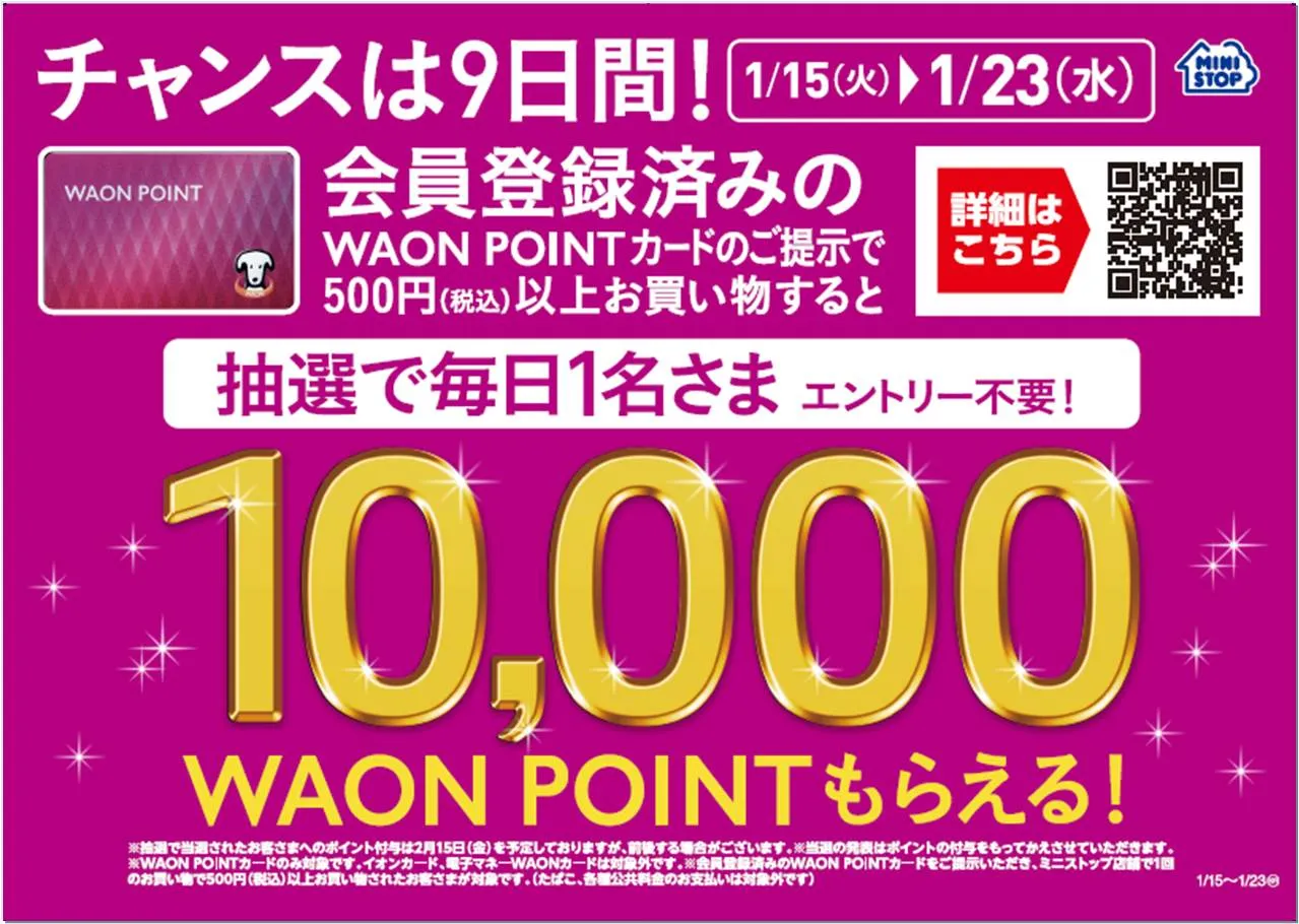 ■実施内容:会員登録済みのWAON POINTカードを提示し、1回の買い物で500円(税込)以上の買い物をされたお客さまを対象に、期間中抽選で毎日1名さまに10,000ポイントが当たります。エントリーは不要です。