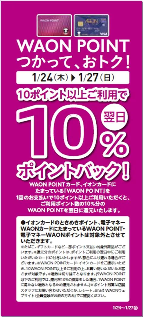 ■実施内容: WAON POINTカード、イオンカードにたまっている「WAON POINT」を1回の支払いで10ポイント以上ご利用いただくと、ご利用ポイント数の10%分(端数切り捨て)のWAON POINTを、翌日中にご利用のカードへ付与します。