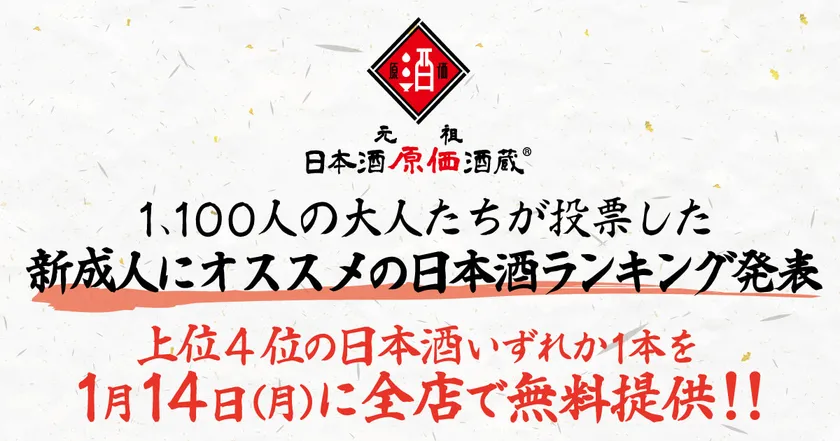 株式会社クリエイティブプレイス(本社:東京都品川区、代表取締役:中村 雄斗、以下 当社)が運営する日本酒が原価で飲める居酒屋の「日本酒原価酒蔵」では、「新成人に飲んでもらいたい日本酒」として調査した日本酒の上位4銘柄のいずれか1本を対象者に無料で提供する“成人式キャンペーン”を、「成人の日」の1月14日から1月20日までの7日間で実施します。