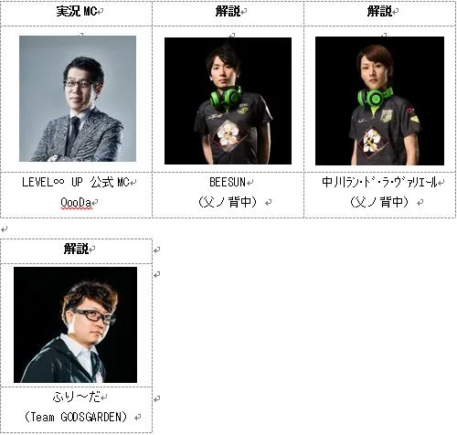 | 出演者 | LEVEL∞ UP 公式MC、実況: OooDa (Twitter: @OooDa) 解説:BEESUN(父ノ背中 所属、Twitter: @nhgbsun) 解説:中川ラン・ド・ラ・ヴァリエール(父ノ背中 所属、Twitter: @QooLAmD) 解説:ふり~だ(Team GODSGARDEN所属、Twitter: @frieda0914) |