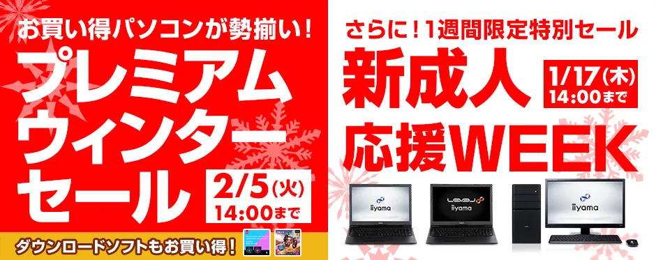 ただいま開催している「プレミアムウィンターセール」の追加イベントとして「新成人応援WEEK」を実施いたします。セール対象パソコンを期間限定の特別価格でご提供いたします。