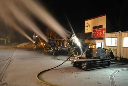 スノーファンは、空中に圧縮した空気と霧状の水を吹き上げることで、人工的に雪を造る機械です。一度に多くの水を排出し大量の雪を造ることができるのが特徴です。稼働条件として、気温が-2℃を下回ることが必要で、今年度は年末年始の寒波を追い風に稼働させてゲレンデを拡張することができました。