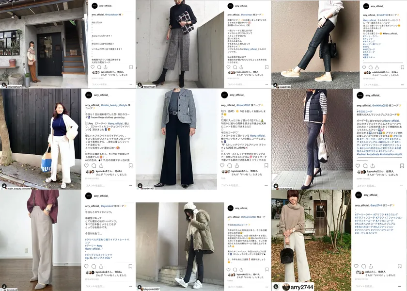InstagramからARRY公式ページアカウント @arry_official_ のアンバサダー候補を募集し、参加して頂いた方に商品を提供して、コーディネートと感想と「#アーリーラバー」のハッシュタグを付けて投稿していただいています。
