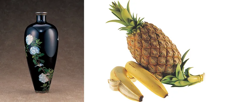 左から、【七宝】並河靖之 《紫陽花図花瓶》 清水三年坂美術館蔵、【牙彫】安藤緑山《パイナップル、バナナ》清水三年坂美術館蔵