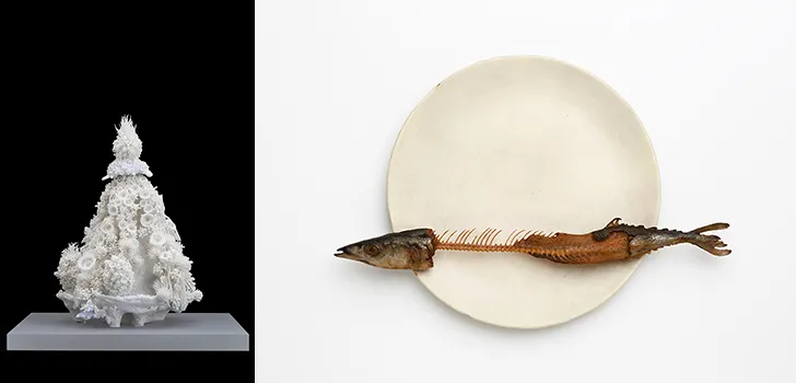 左から、【陶磁】稲崎栄利子《Arcadia》2016年、【木彫】前原冬樹 《一刻:皿に秋刀魚》 2014年