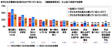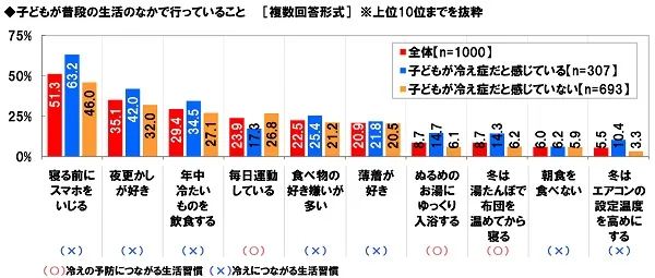また、同じ選択肢について、子どもにあてはまるものを選んでもらったところ、「寝る前にスマホをいじる」が最も高く51.3%、次いで、「夜更かしが好き」が35.1%、「年中冷たいものを飲食する」が29.4%となりました。
