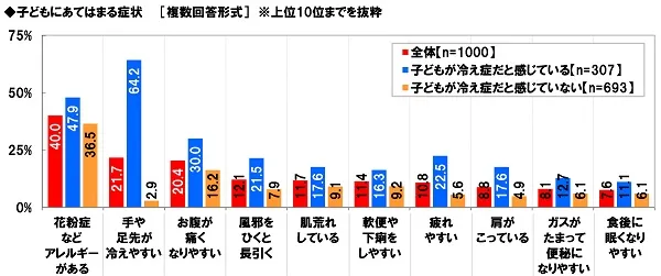また、子どもにあてはまる症状を聞いたところ、「花粉症などアレルギーがある」が最も高く40.0%、次いで、「手や足先が冷えやすい」が21.7%、「お腹が痛くなりやすい」が20.4%となりました。