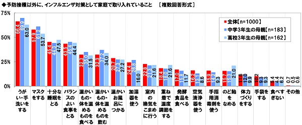 続いて、全回答者(1,000名)に、予防接種以外に、インフルエンザへの対策として家庭で取り入れていることを聞いたところ、「うがい・手洗いをする」が最も高く66.4%、次いで、「マスクをする」が57.9%、「十分な睡眠をとる」が45.4%、「バランスのよい食事をとる」が43.5%、「温かいもの・体を温めるものを食べる」「温かいもの・体を温めるものを飲む」がどちらも32.3%となりました。うがい・手洗いやマスクといった対策のほか、睡眠や食事など生活習慣を整えることで対策をしている人が多いようです。