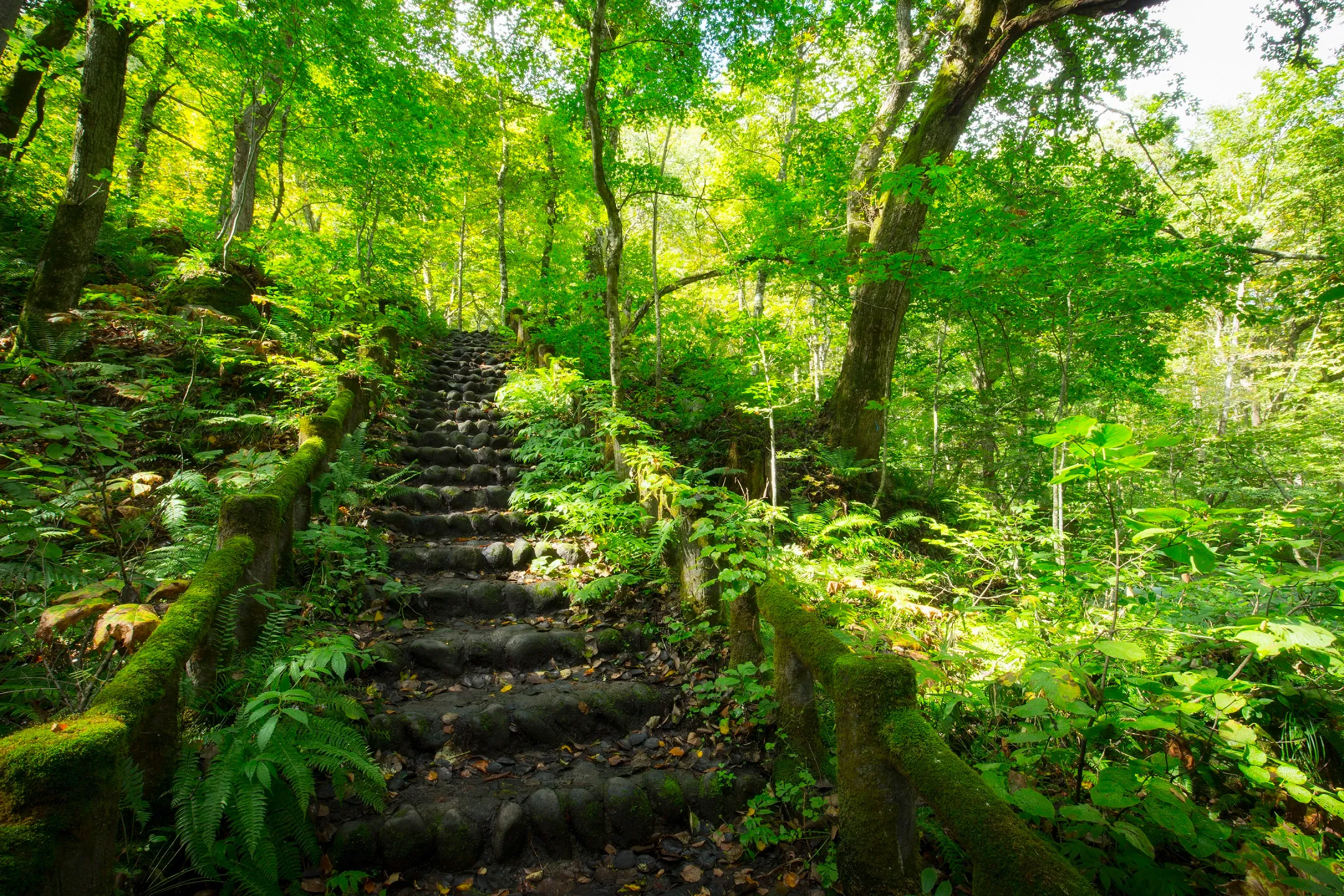 渓流のすぐ傍を歩きながら、苔観察ができるスポットです。苔に覆われた階段は、記念撮影の場所としても人気です。