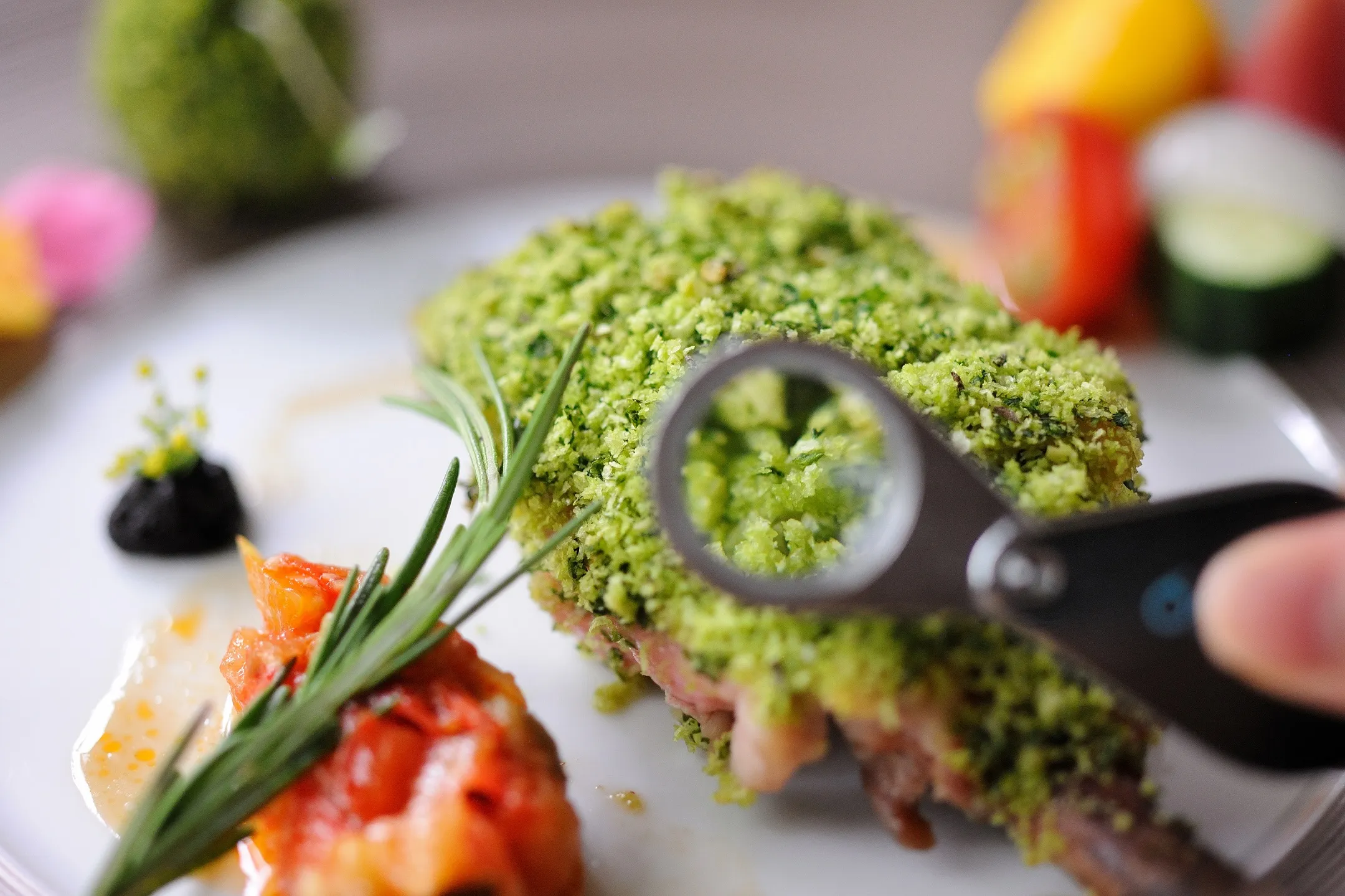 ランチでは、「苔ランチプレート」を提供します。メインのチキンにはパセリとにんにくを混ぜたパン粉をまぶし、奥入瀬渓流に点在する苔むした岩を表現しました。料理を食べる前に、ルーペを使い、実際に苔を観察している気分を体験できます。