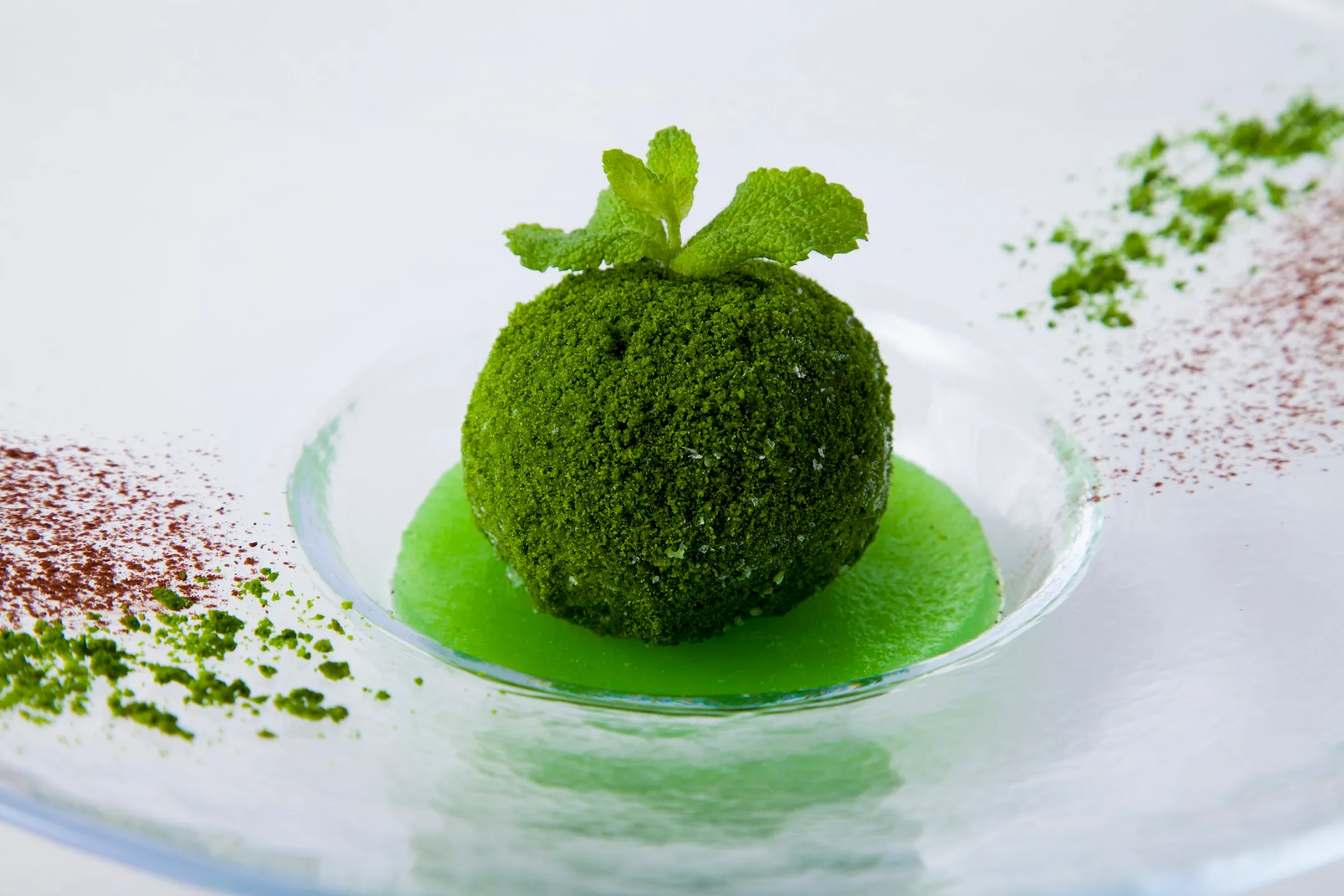 デザートには、プラン限定の「こけ玉アイス」を楽しむことができます。抹茶アイスに、ほうれん草のパウダーをまぶし、こけ玉そっくりに仕上げたこけ玉アイスはホテルオリジナルのスイーツです。そのほか、抹茶リキュールで、森の倒木に生息している苔を表現した「苔カクテル」も用意しています。