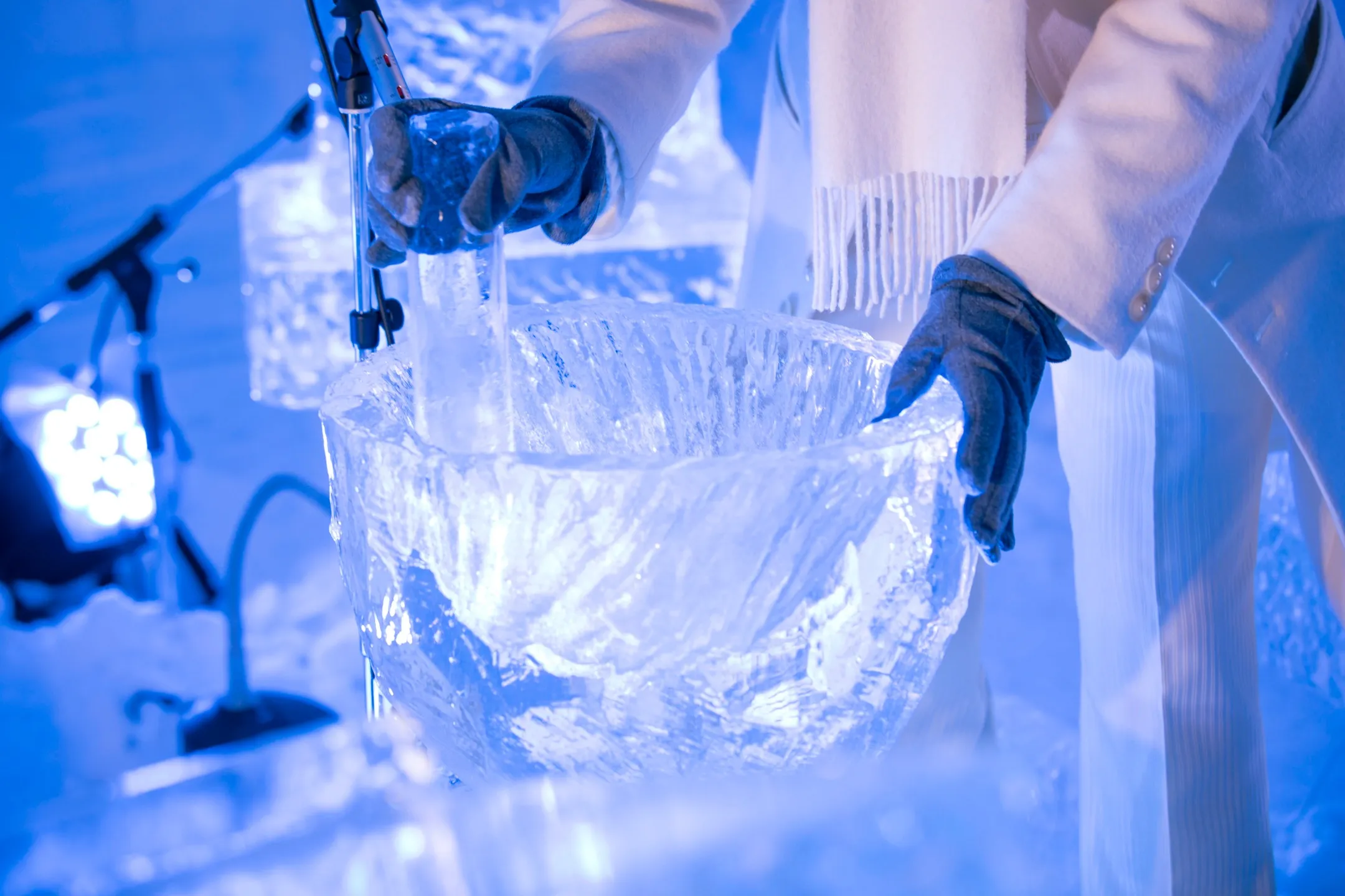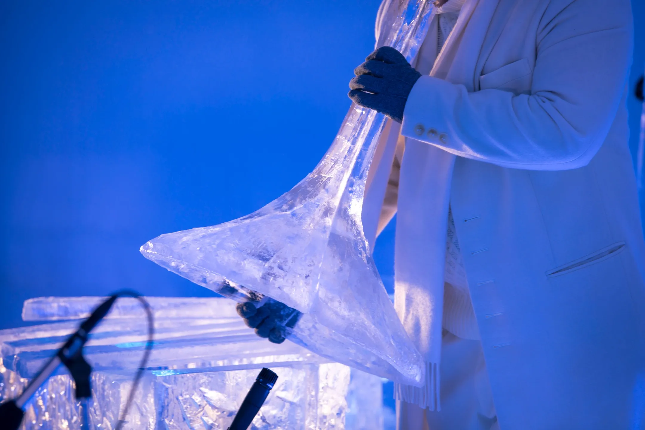当コンサートでは、氷で作られた5種類の楽器で演奏が行われます。氷の楽器は、ウィンドチャイムや木琴などの打楽器をイメージして、氷をナイフやノミで削って製作される点が特徴です。また、これらは、温度変化に左右されやすいため、演奏者が当コンサートに合わせて音を調整し、一夜限りで使用されます。当コンサートでは氷の楽器は奏でられる繊細な音色のみならず、その透き通った見た目も楽しめます。