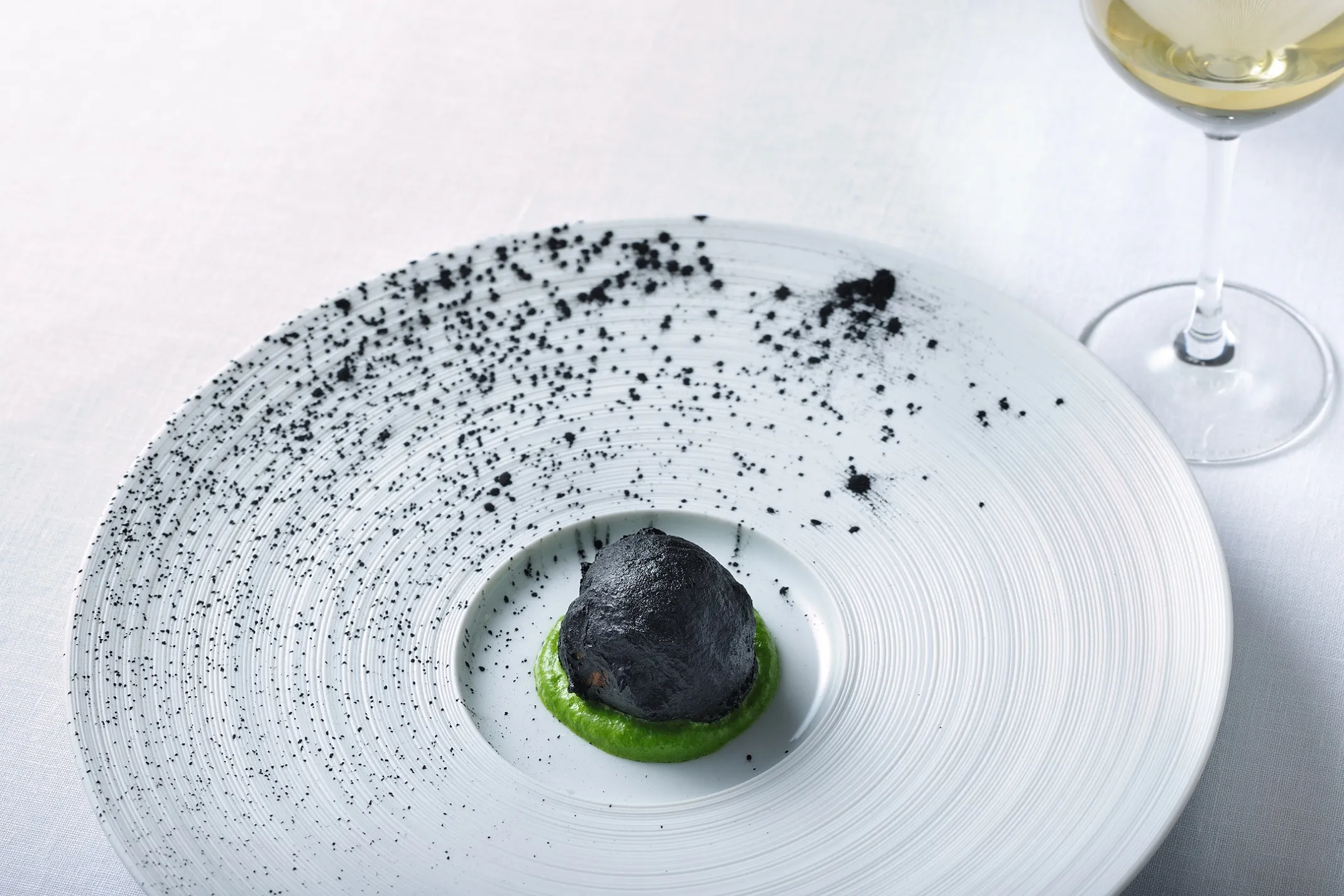 野菜の旨味をたっぷりと含んだ筍のリゾットは、竹炭とイカスミを合わせたペーストで包みました。下には鮮やかな緑が印象的な、木の芽のピュレを敷き、春の食材ならではの苦味や香り、そして筍の食感も楽しめます。ワインはスッキリとした味わいの「ドメーヌオヤマダ BOW!ブラン」(山梨県甲州市)を合わせます。柑橘を感じる爽やかなワインの香りが、イカスミと竹炭の風味と木の芽の香りを引き立て、果実の甘みと穏かな酸味が、筍の味わいを優しく包みます。