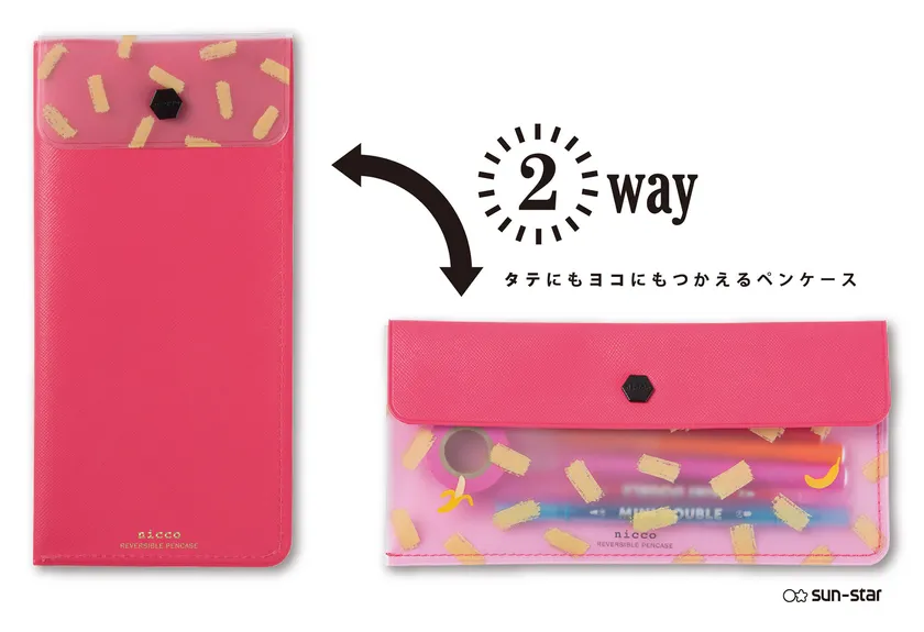 サンスター文具株式会社(本社:東京都台東区、代表取締役社長:小林 大地)は、タテにもヨコにも使えるマルチなリバーシブルペンケース『nicco(ニッコ)』全8柄(880円税抜/950円税込8%)を2019年2月下旬より順次展開いたします。両面に開け口があることで、デスクのスペースや気分によって形やデザインを変えられる新タイプのペンケースです。