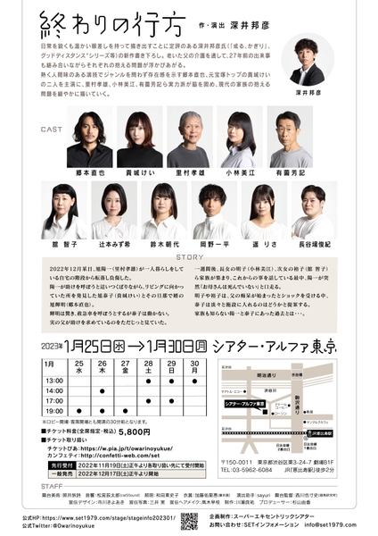 スーパーエキセントリックシアター(東京都品川区、代表:大関 真)主催、『終わりの行方』が2023年1月25日(水)~1月30日(月)にシアター・アルファ東京(東京都渋谷区東3-24-7 劇場B1F)にて上演されます。
