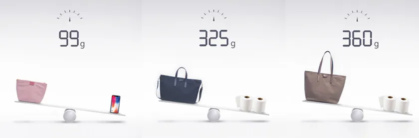 このバッグシリーズでもっとも特徴的なのがカバン自体の軽さです。ミニバッグ99g、トートバッグ325g、ショッパーバッグ360gでスマートフォンより軽くて育児に大変なママの肩を助けます。