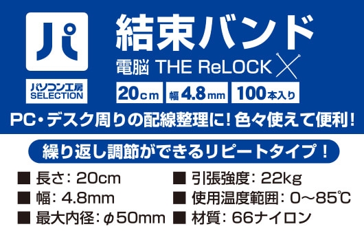 商品名: 結束バンド 電脳 THE ReLOCK 繰り返し調節ができるリピートタイプ 長さ20cm / 幅4.8mm / 100本入り