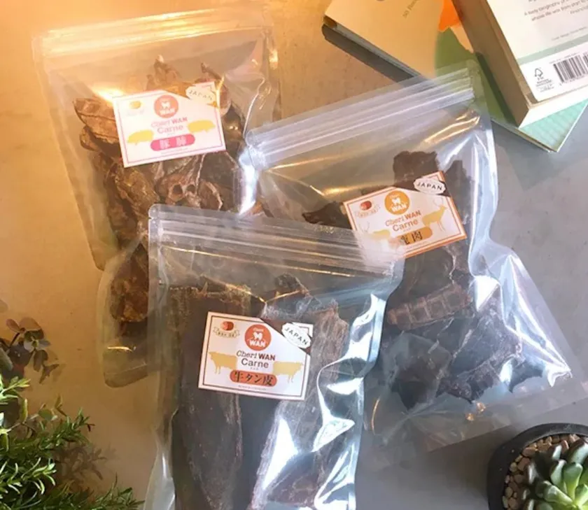 CheriWAN Carneのおいしいお肉のジャーキーはもちろん国産。通常は食肉加工している工場に、愛犬向けの商品としての加工をお願いしました。ヒト向けのお肉と同じ工程だからこそ、安心安全の自信をもってお勧めできます。