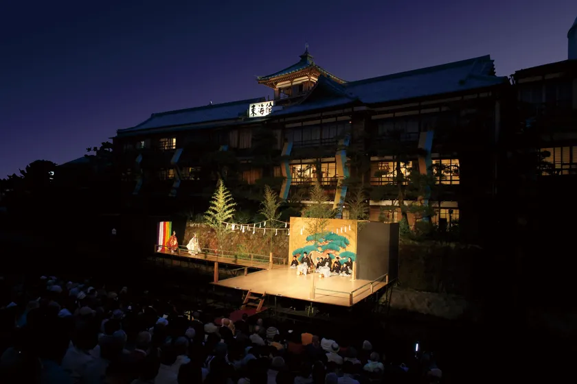 舞台の後ろには伊東市指定文化財の木造3階建ての旅館「東海館」がそびえ立ち、その景色は観客の皆様を見たことのない幽玄の世界へと導きます。