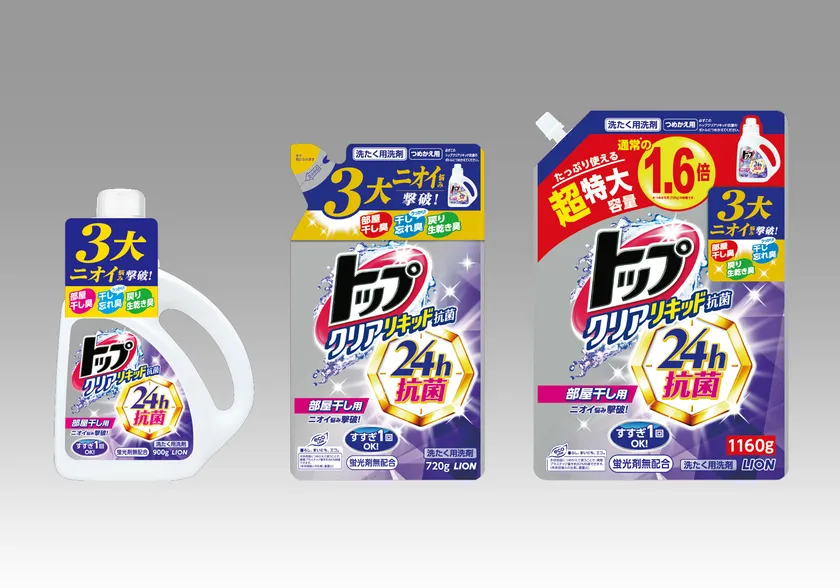そこでこの度、24時間抗菌で、菌による三大ニオイ悩み「部屋干し臭」・「干し忘れ臭」・「戻り生乾き臭」を解消する『トップ クリアリキッド抗菌』を新発売いたします。