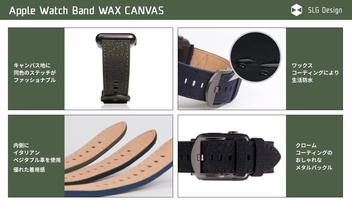 本製品は、100%コットン素材で作られたキャンバス地にワックスコーティングを施し、バンドの内側にはイタリア産カーフベジタブルレザーを贅沢に使用した、シンプルながら高級感にこだわったApple Watch専用バンドです。アクティブでカジュアルなライフスタイルに合わせてApple Watchをコーディネートできます。